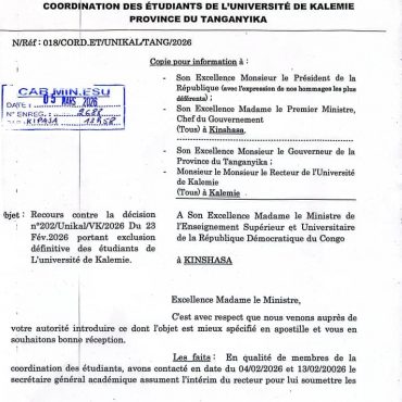 Quatre étudiants de l’Université de Kalemie ont introduit un recours auprès de la ministre de l’Enseignement supérieur et universitaire (ESU) pour contester leur exclusion définitive décidée par les autorités académiques. Dans ...