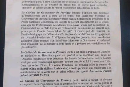Read MoreLubumbashi : une récompense de 5000$ offerte à toute personne qui détient l’information utile de la mort tragique du journaliste patriq Adonis Numbi