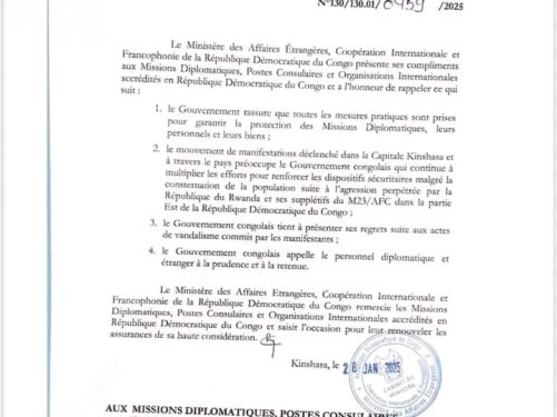 Read MoreDans un communiqué officiel, le Gouvernement de la République Démocratique du Congo (RDC) a exprimé ses regrets suite aux actes de vandalisme survenus lors des récentes manifestations à Kinshasa. Ce message, émis par le Ministère ...