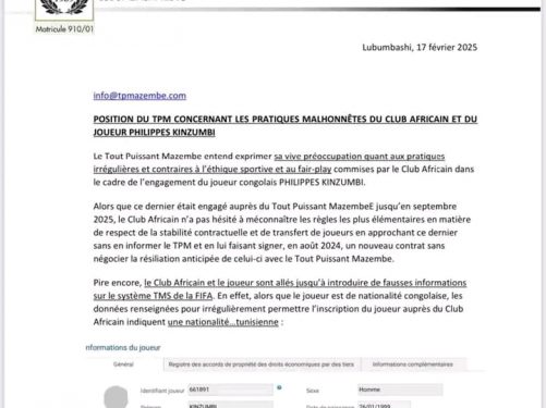 Le Tout Puissant Mazembe (TPM) est monté au créneau pour dénoncer ce qu’il qualifie de manœuvres malhonnêtes de la part du Club Africain et de son joueur Philippe Kinzumbi. Selon un communiqué du Secrétaire général ...