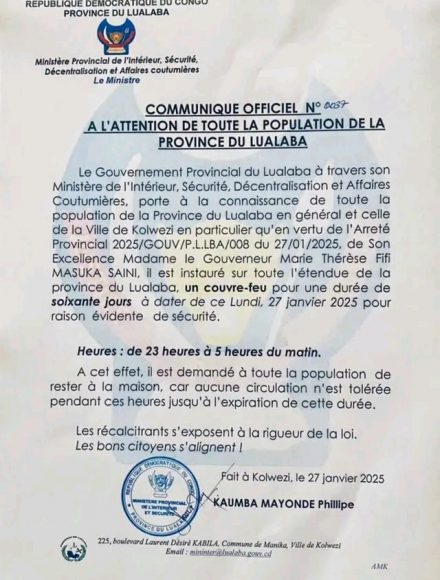 Read MoreLe Gouvernement Provincial de Lualaba a annoncé, par le biais de son ministère de l’Intérieur, l’instauration d’un couvre-feu généralisé dans toute la province. Cette ...