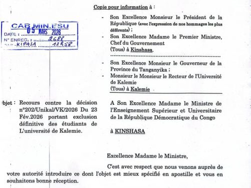 Quatre étudiants de l’Université de Kalemie ont introduit un recours auprès de la ministre de l’Enseignement supérieur et universitaire (ESU) pour contester leur exclusion définitive décidée par les autorités académiques. Dans une correspondance datée du 9 ...