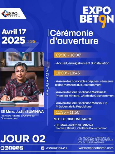 La neuvième édition d’EXPOBETON RDC s’ouvrira en grande pompe ce jeudi 17 avril 2025, avec la participation attendue de la Première Ministre et Cheffe du ...