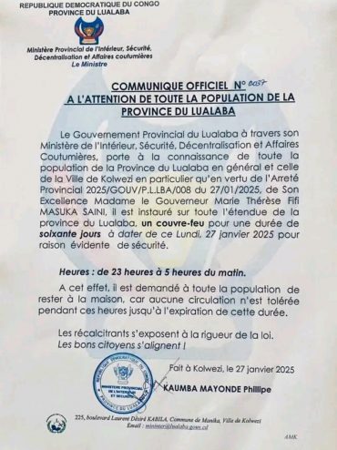 Read MoreLe Gouvernement Provincial de Lualaba a annoncé, par le biais de son ministère de l’Intérieur, l’instauration d’un couvre-feu généralisé dans toute la province. Cette ...