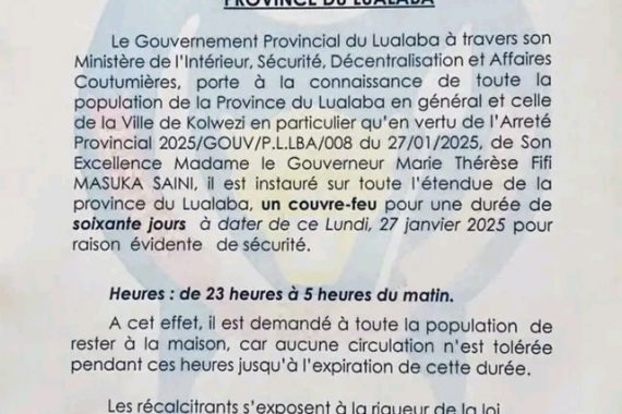 Read MoreLe Gouvernement Provincial de Lualaba a annoncé, par le biais de son ministère de l’Intérieur, l’instauration d’un couvre-feu généralisé dans toute la province. Cette ...