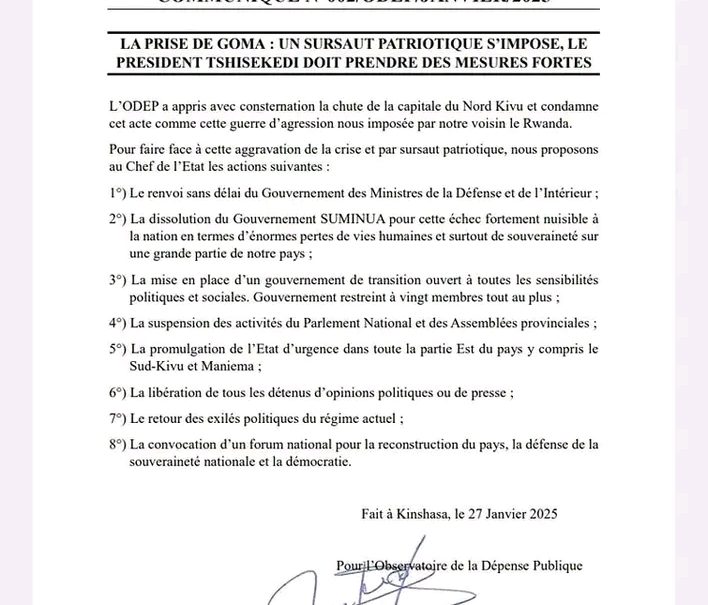 RDC : L’ODEP exige une refonte complète de la gouvernance pour répondre à la crise sécuritaire Face à la détérioration de la situation sécuritaire en République démocratique du Congo (RDC), l’Observatoire de la Dépense Publique (ODEP) a adressé un plaidoyer fort au président Félix Tshisekedi, appelant à une transformation radicale du leadership national. Pour l’organisation, l’urgence n’est plus à la gestion classique des affaires courantes, mais à une révision profonde des ...