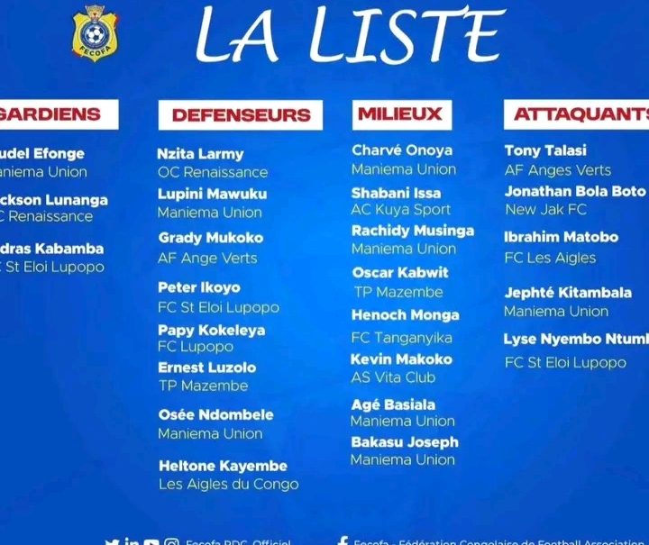 Read MoreOtis Ngoma, sélectionneur de l'équipe nationale de football de la République Démocratique du Congo, a publié ce mardi 14 janvier 2025 la liste des 23 joueurs retenus pour prendre part au Championnat d'Afrique des Nations (CHAN) 2024. Une surprise dans cette sélection : pour la première fois, le TP Mazembe, club phare du pays, n'a que quatres joueurs appelés, tandis que l'As Maniema Union, place huit de ...