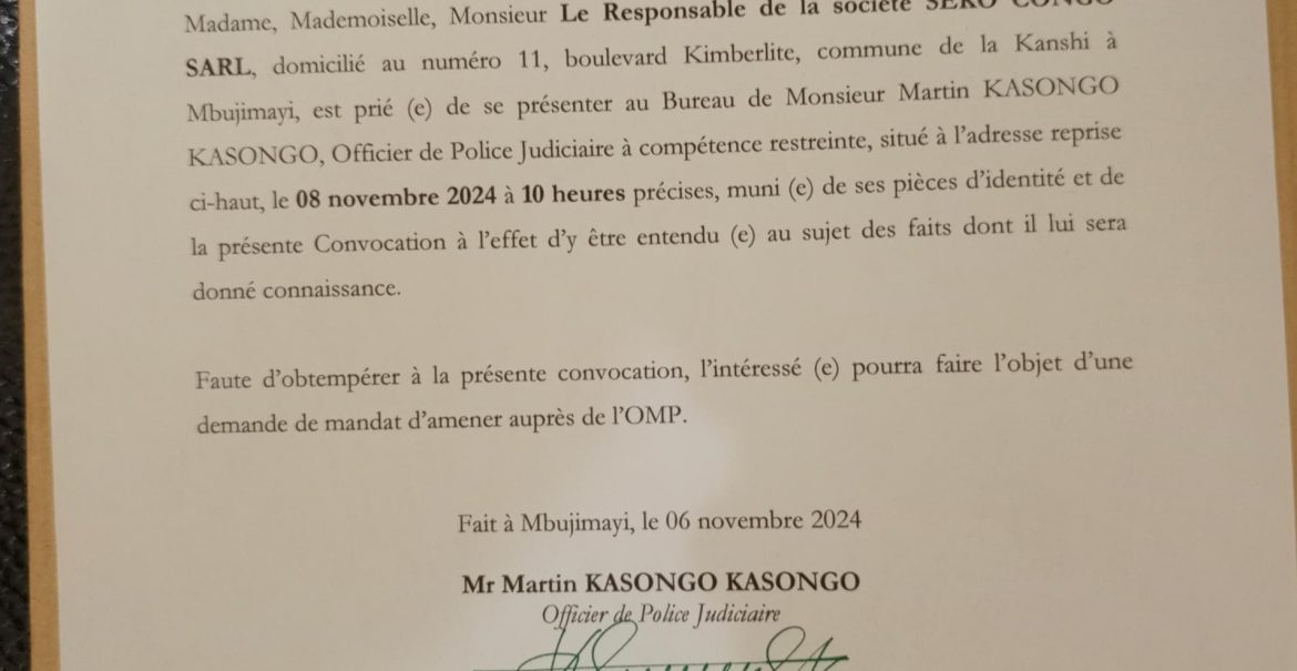 Depuis ce mercredi 6 novembre 2024, SEKO CONGO qui est partenaire actif de la République Démocratique du Congo, particulièrement, de la Société Minière de Bakwanga, dans le cadre de la relance de la MIBA pour l'électrification de l'Espace grand Kasai est menacé par le corps de la police judiciaire de la ville de Mbuji-Mayi, dans une convocation fabriquée et sans norme portant N° 001/ARE RDC/OPJ PC/MKK/11/2024 signée par un certain ...