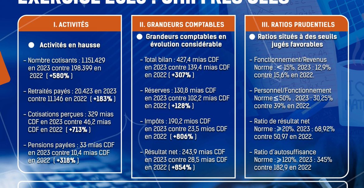 Read MoreCNSSAP - FINANCES EXERCICE 2023 : DE CDF 28,5 MILLIARDS EN 2022 À CDF 243,9 MILLIARDS EN 2023, LE RÉSULTAT NET DE LA CNSSAP EXPLOSE DE PLUS DE 850%* PERFORMANCES FINANCIÈRES ENREGISTRÉES GRÂCE À LA RÉFORME INITIÉE PAR SEM FÉLIX-ANTOINE TSHISEKEDI TSHILOMBO, CHEF DE L'ÉTAT À la clôture de l'exercice 2023, la CNSSAP affiche des chiffres impressionnants, traduisant le pic de ses meilleures performances jamais enregistrées depuis son opérationnalisation en 2017. Cela ...