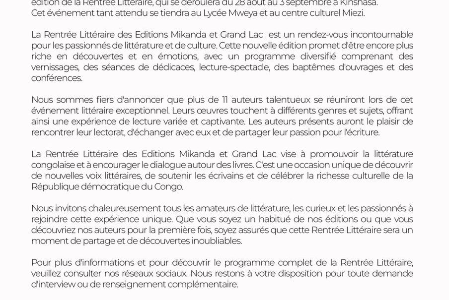 Read MoreCulture : les Éditions Mikanda et Grands Lacs annoncent leur rentrée littéraire pour 2è édition du 28 août au 03 septembre( Communiqué de presse)