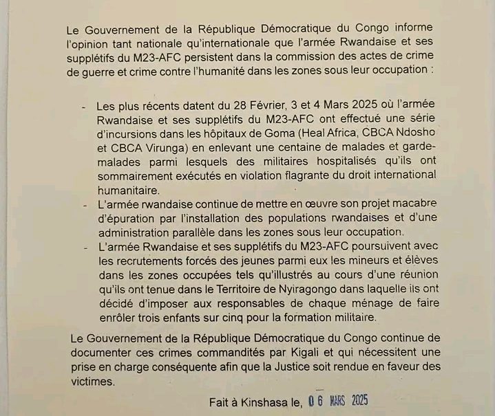 La République démocratique du Congo (RDC) hausse le ton face aux violences persistantes dans l'Est du pays. Dans un communiqué officiel publié ce jeudi 6 mars, le gouvernement congolais accuse une nouvelle fois l'armée rwandaise et le groupe armé M23-AFC de commettre de graves exactions, notamment des crimes de guerre et des violations des droits humains dans les zones sous leur contrôle. Des attaques ciblant des hôpitaux Parmi les faits récents dénoncés ...